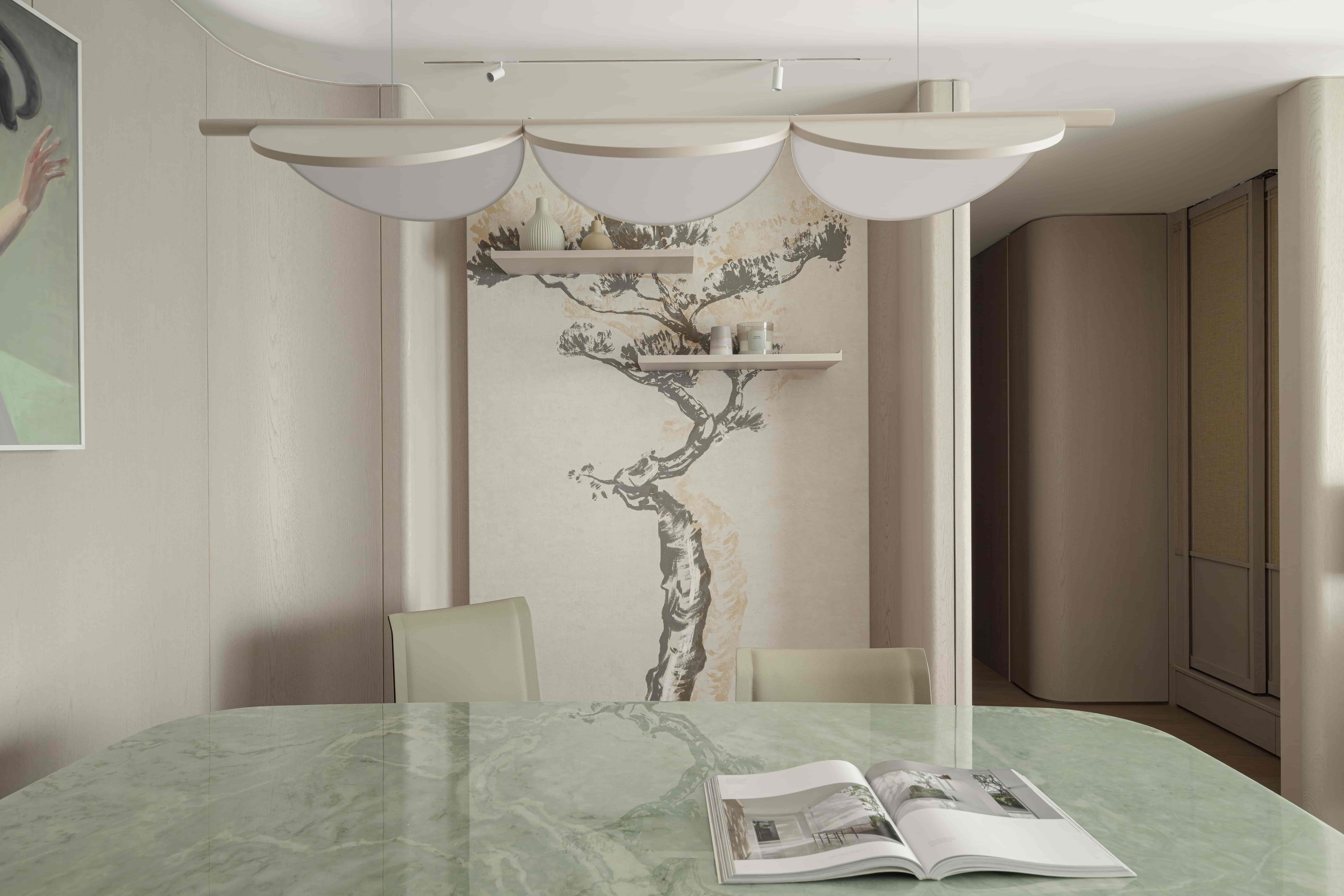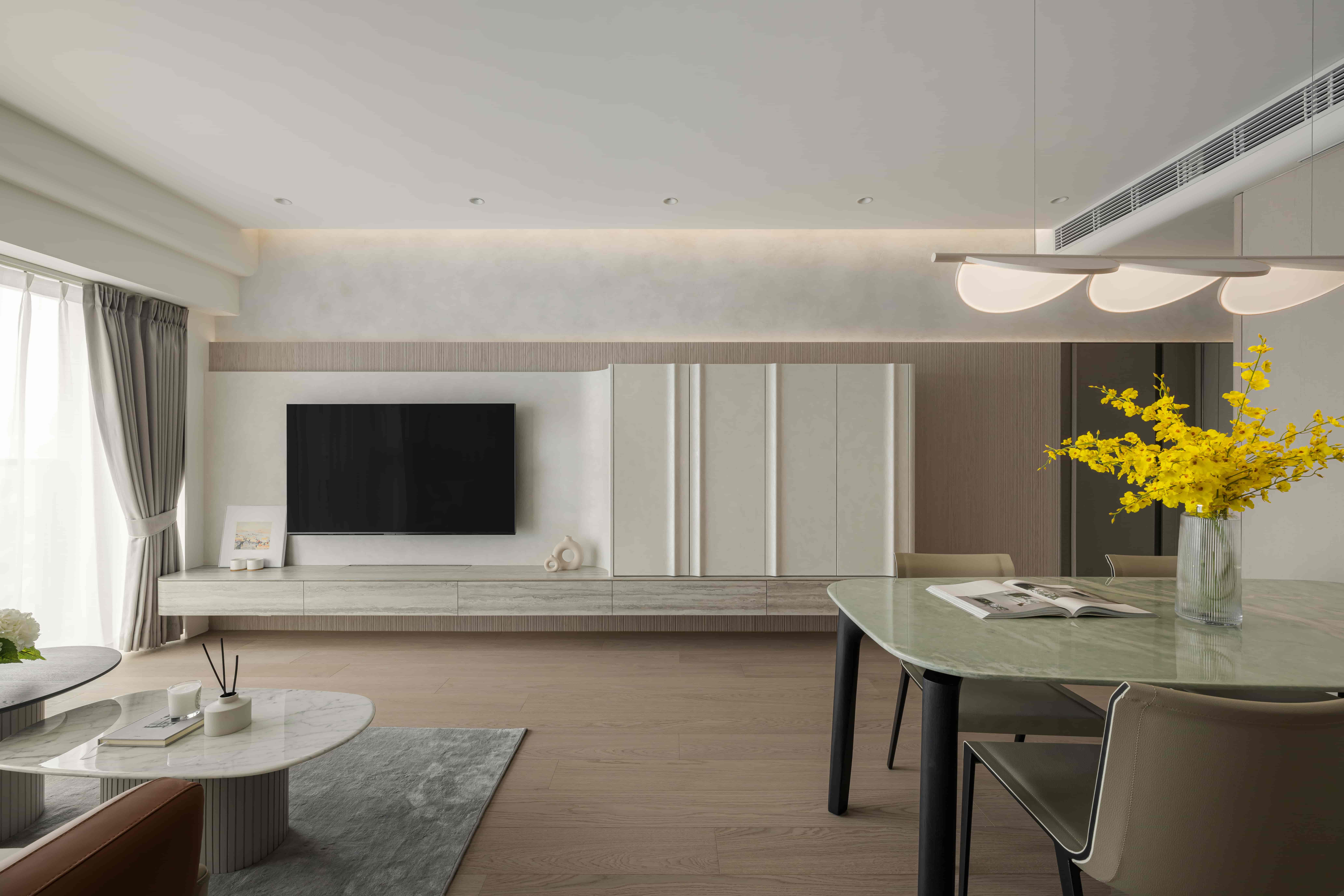 The TV wall in the living room is made of Italian art paint, and the combination of different textures and materials creates multiple visual feasts. The false ceiling runs through the entire living and dining room, weakening the pressure of the beams and columns, and combined with the lighting design, the overall sense of space in the two areas is expanded.