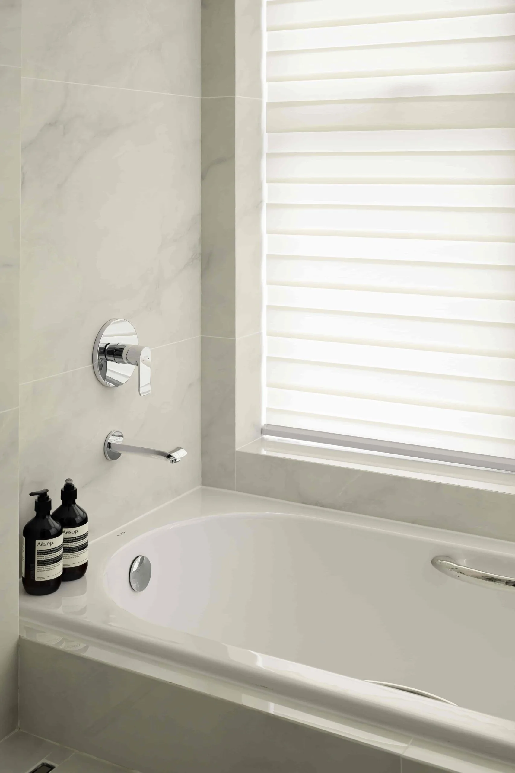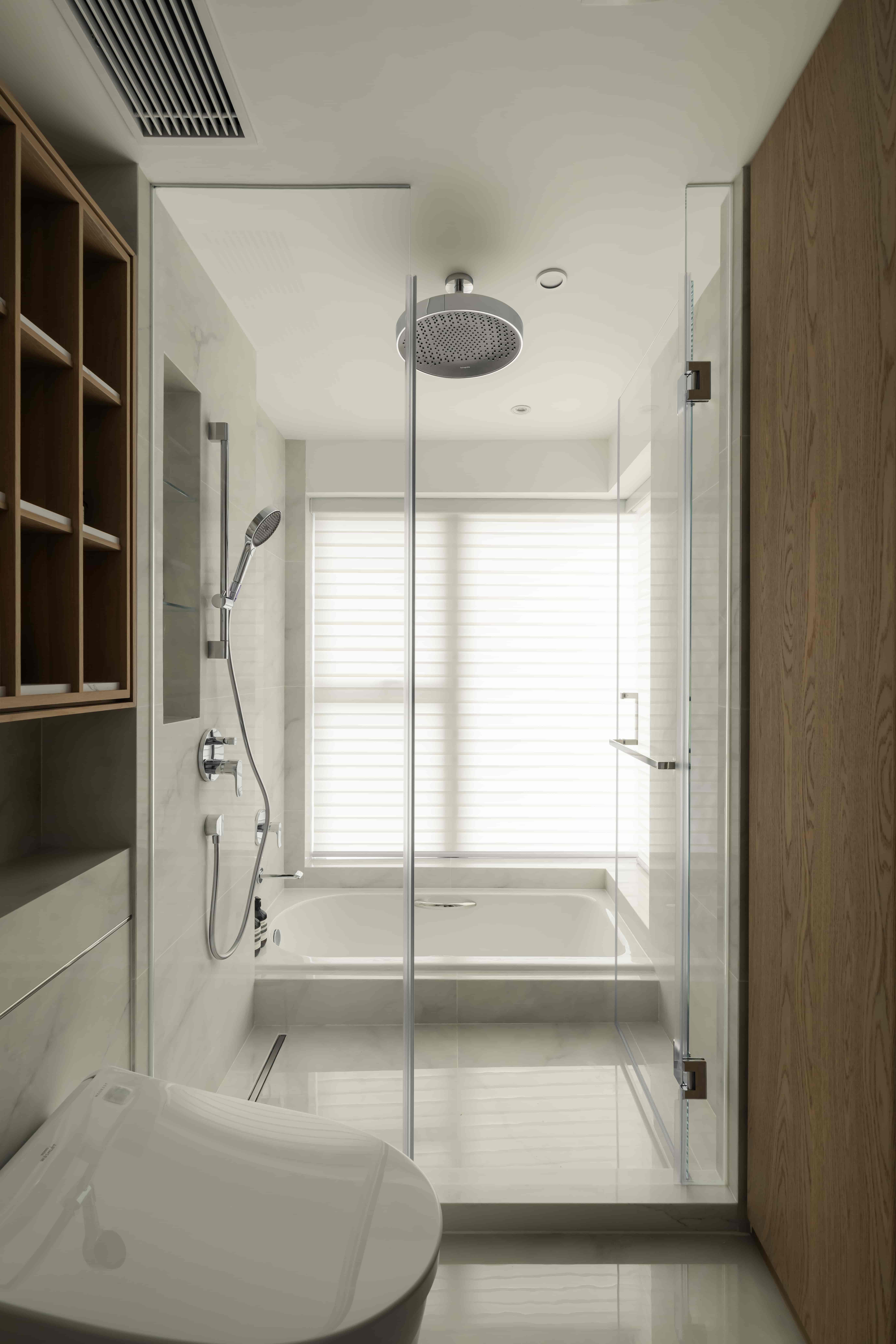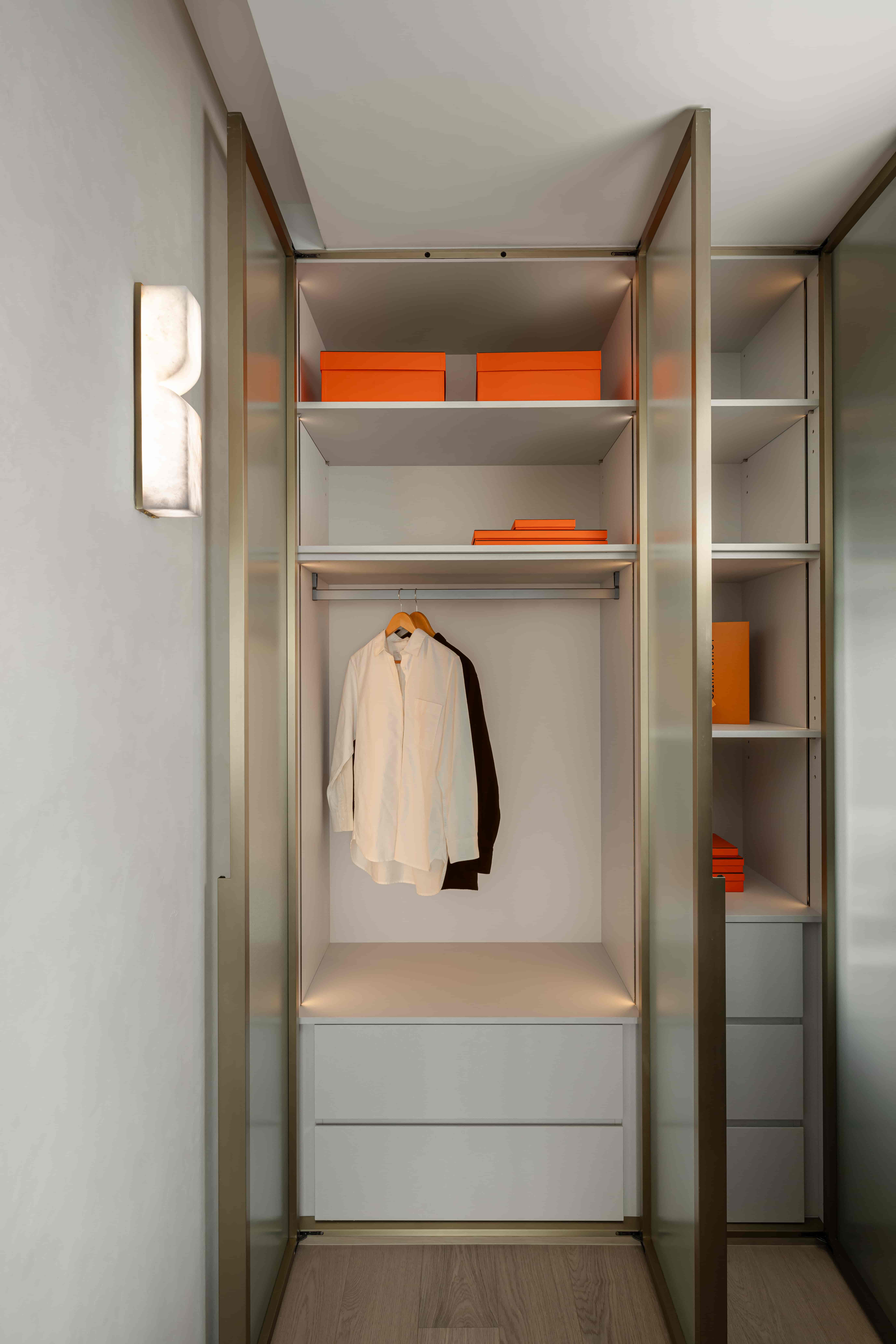 In line with the owner’s lifestyle, the designer opened the original two bedrooms into a master suite and used textured forest-pattern wallpaper as a highlight, thus enhancing the quiet and stylish atmosphere of the room. The ensuite bathroom also has a bright feel. , the space is decorated with white marble surfaces and glass, while the open cloakroom uses two tall system cabinets on the left and right, paired with a small dressing table, to make the space more complete.