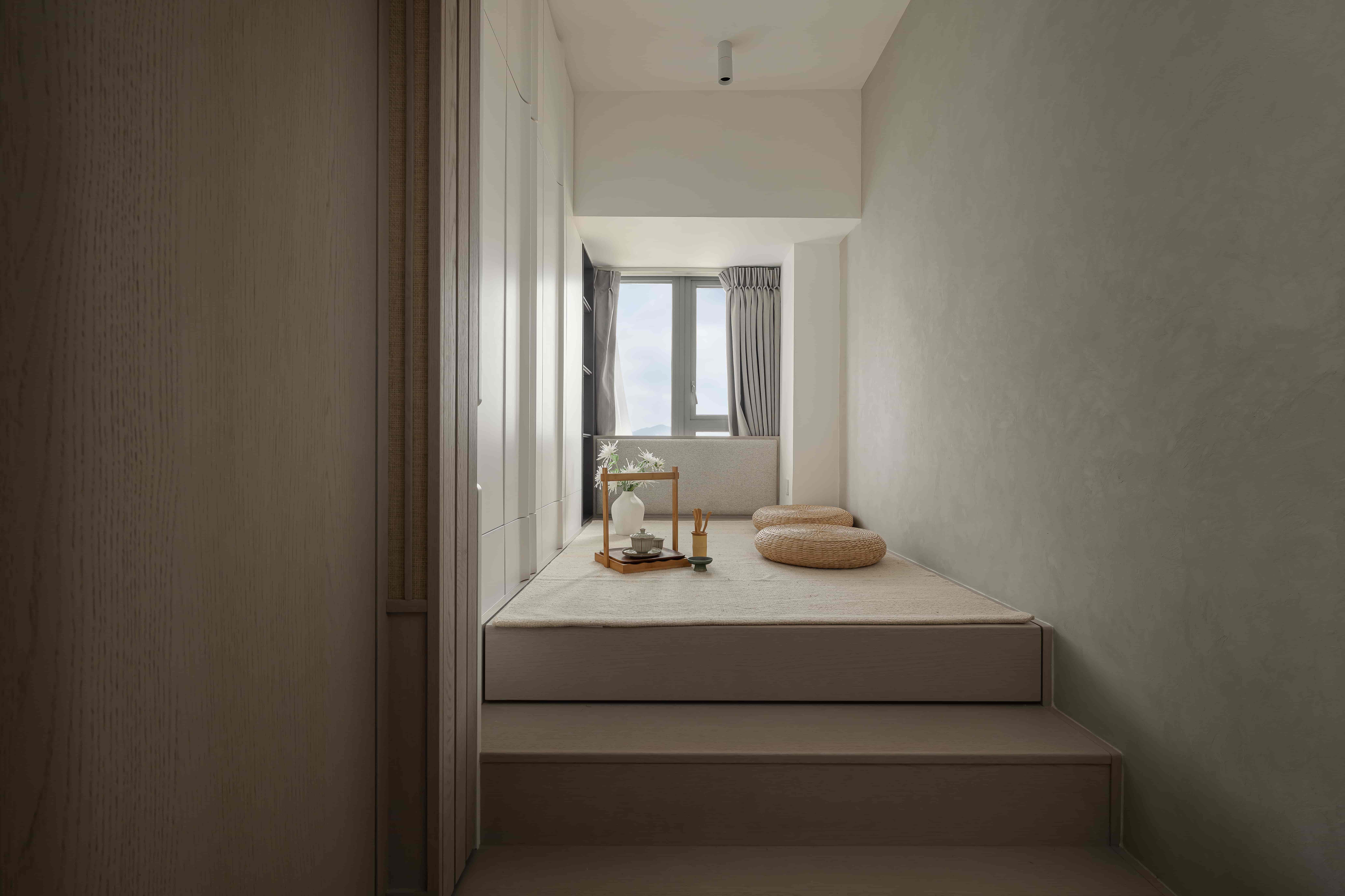 The guest room is made of natural wood and tatami mats combined with a raised floor, which not only increases the storage capacity, but also indirectly divides a small Japanese room, which is usually used as a study or a yoga space. The simple lines bring a leisurely and comfortable space for the owner to relax.