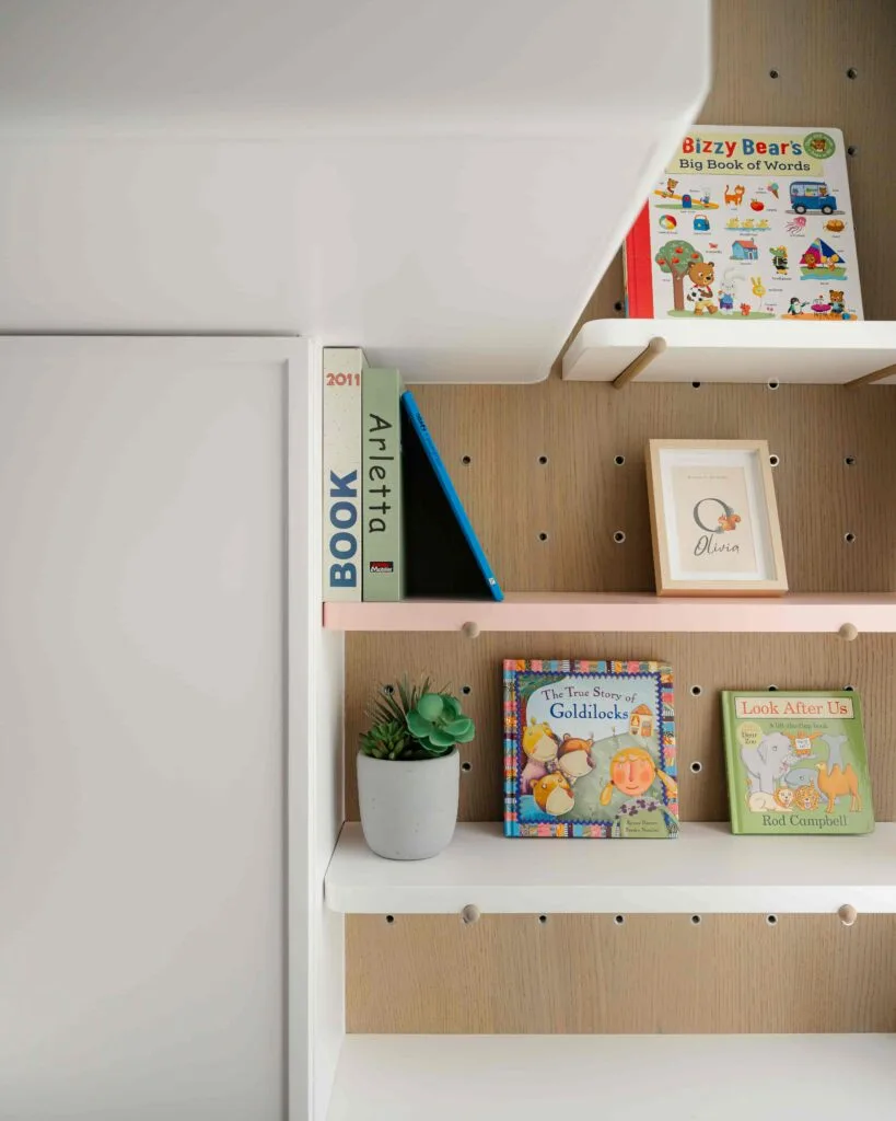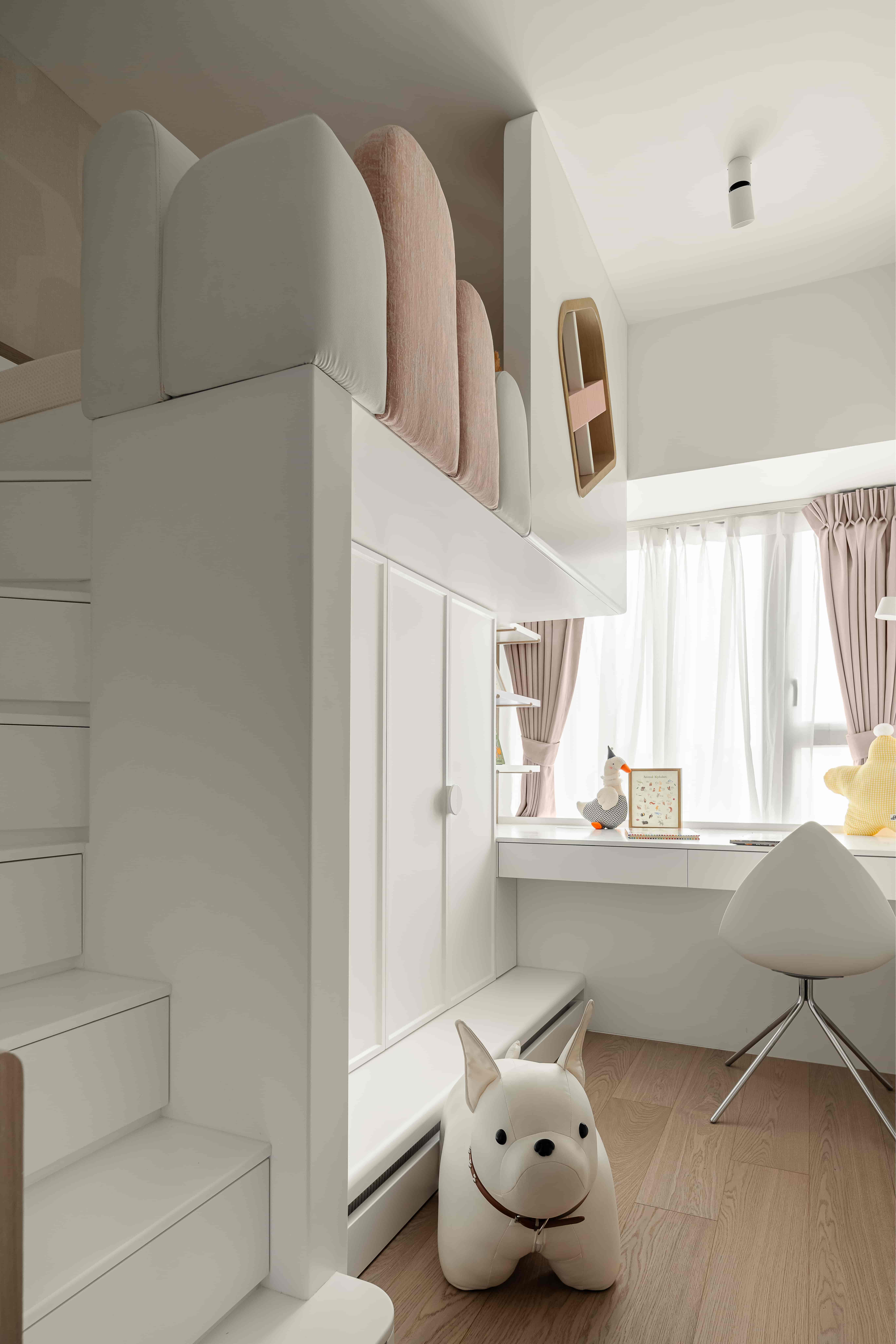 The daughter’s room uses geometric wall paint to make the room full of fun and vitality. The bear-patterned modular bed is connected to a multi-functional storage cabinet, and a desk facing the mountain view is added next to it to create a private space for her daughter to study peacefully. .
