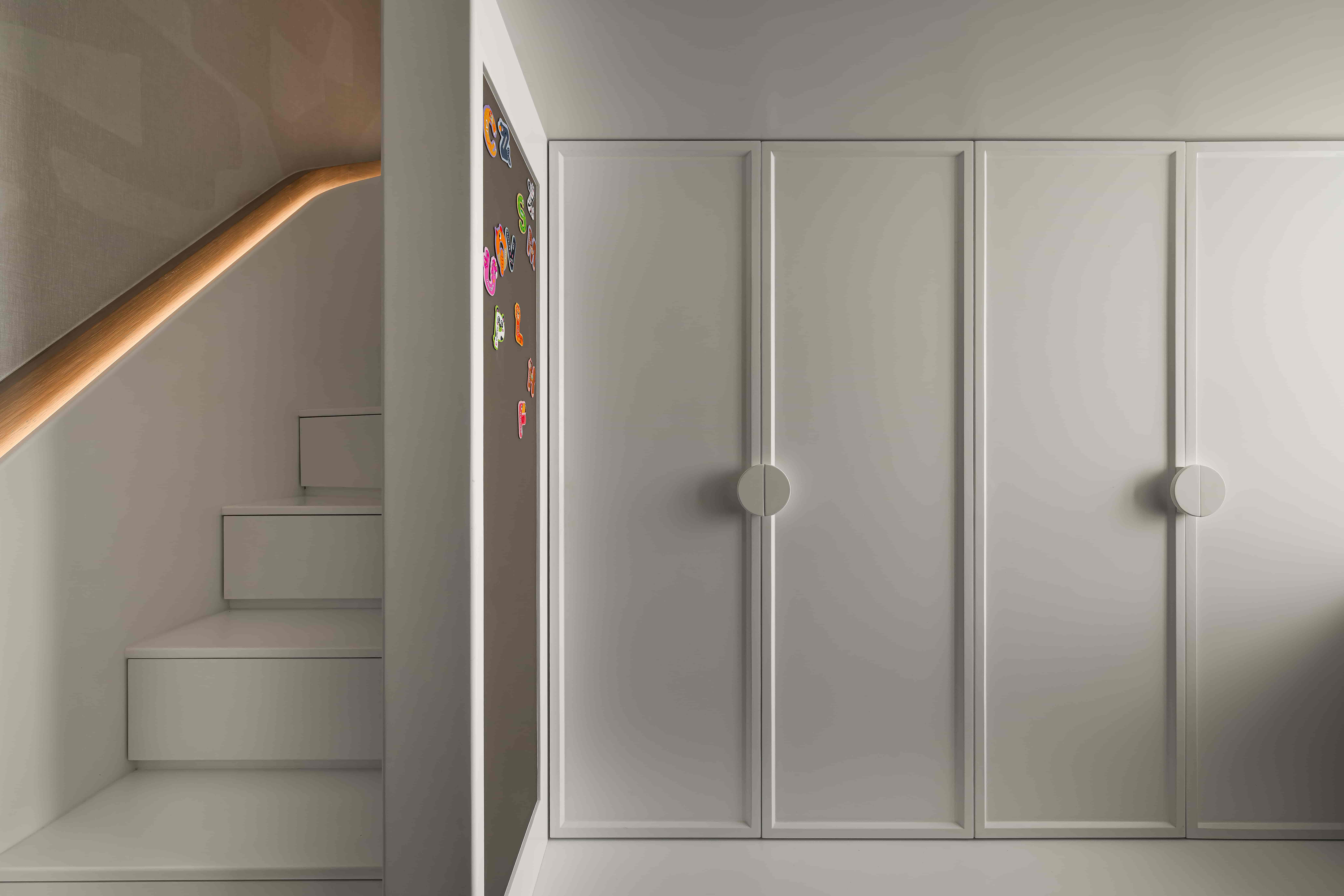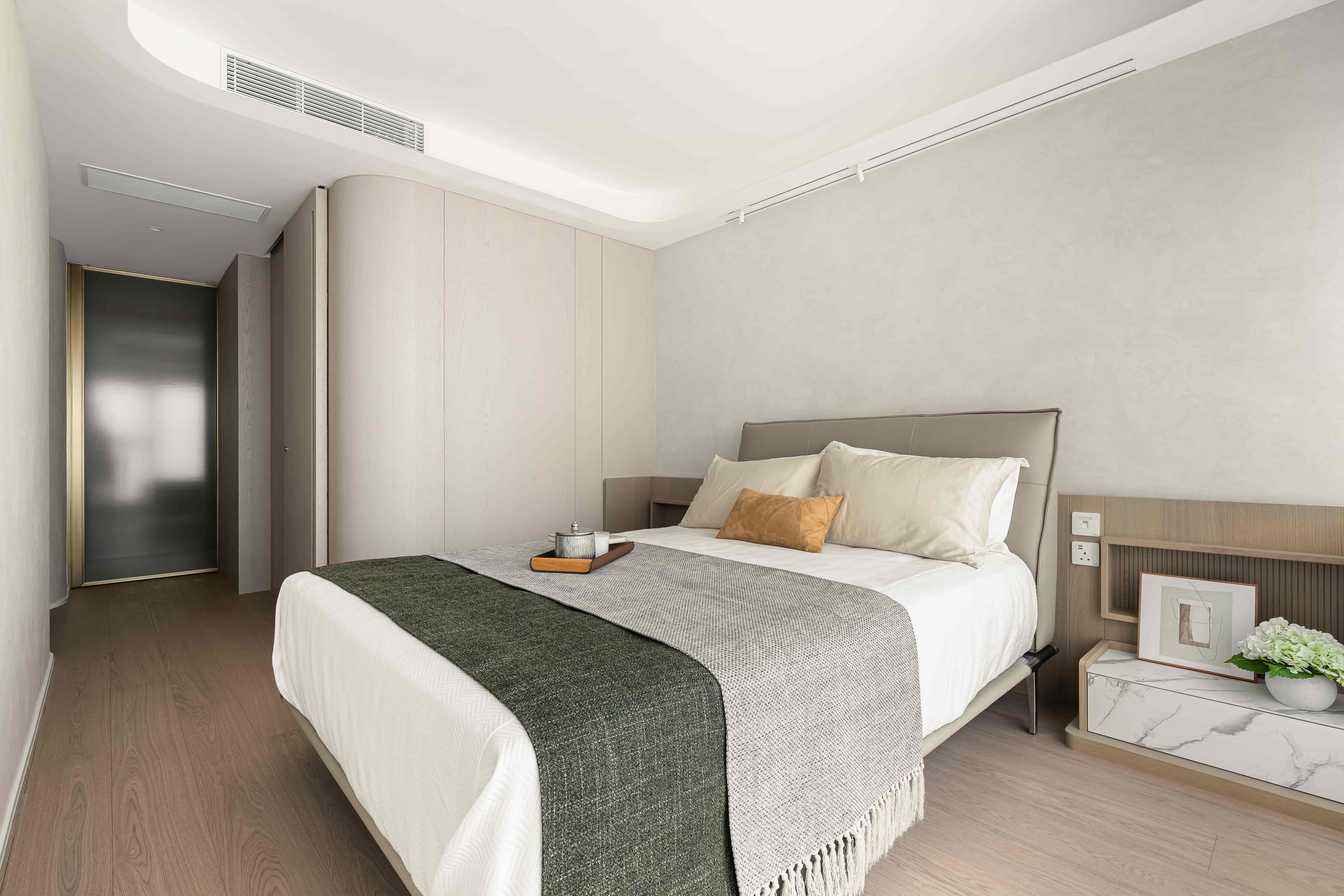 In order to make the space look softer and more harmonious, one wall of the master room was polished into rounded corners, which increased the beauty of the lines in the room and made the entire space look more smooth and unified.