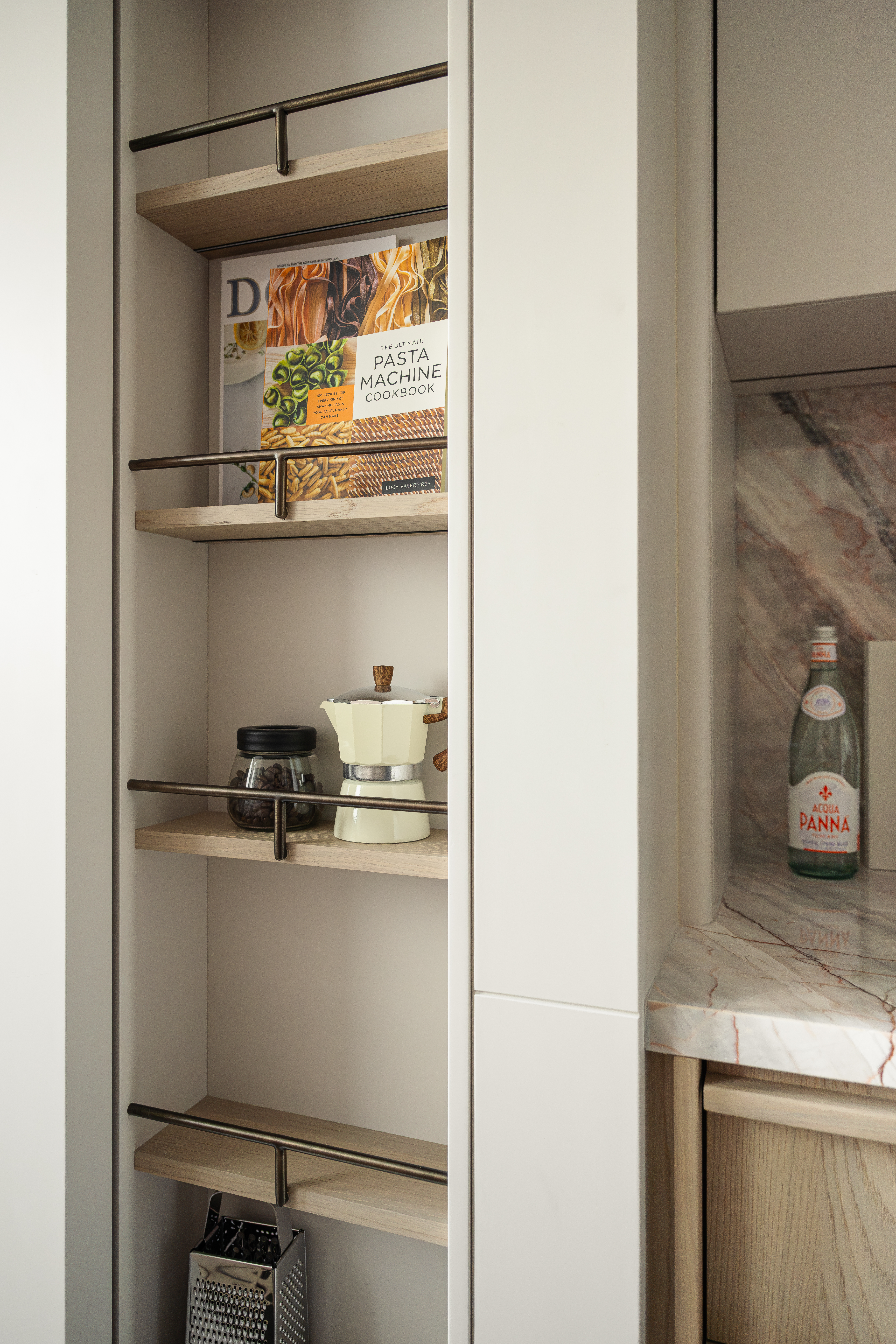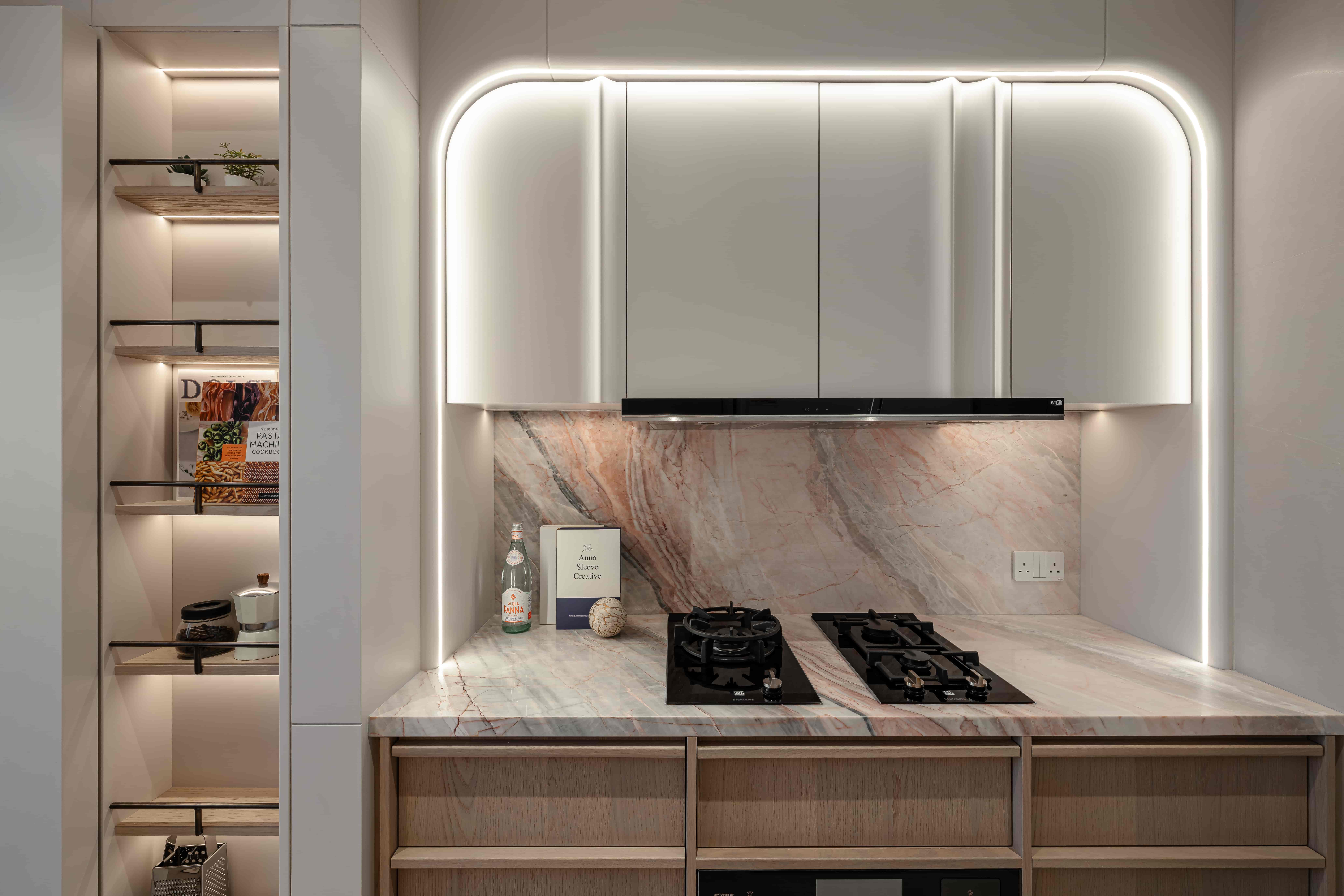 The kitchen uses light wood grain cabinets inlaid with light pink marble. The collision of natural materials creates a clean and elegant kitchen atmosphere. A built-in wine cabinet is hidden behind the cabinet door to meet the storage needs of the kitchen.