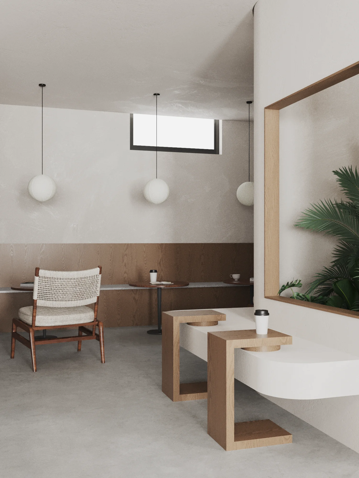 The minimalist and light wood decor creates a sense of calm throughout, complemented with lots of plants.