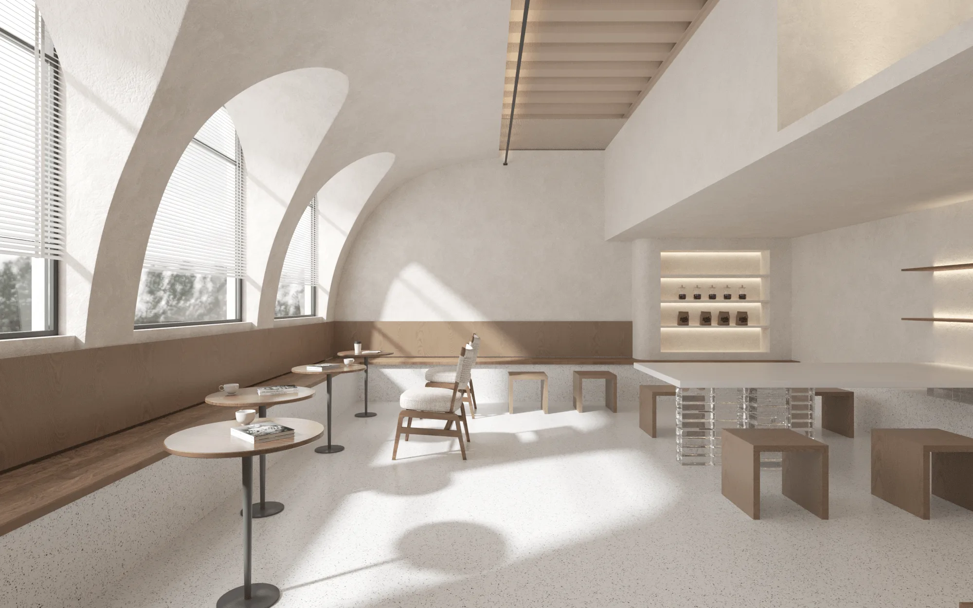 The space is divided into two areas; the 2nd floor area for tastings and social events. The entire space is mainly white and filled with natural light from the existing skylights, which contrasts with the warm wooden background.