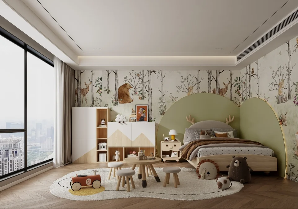 The children’s room is full of the forest fairy tale style. A movable area provides space for children to play and study. The other side of the wall is designed with an integrated desk and wardrobe to create more storage space.