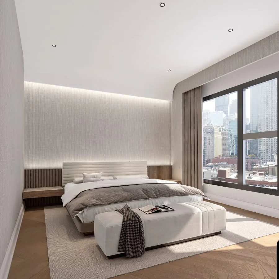The masteroom uses light colors with artistic paint and natural wood veneer to enhance the warmth, highlighting the leisurely style and delicate texture.