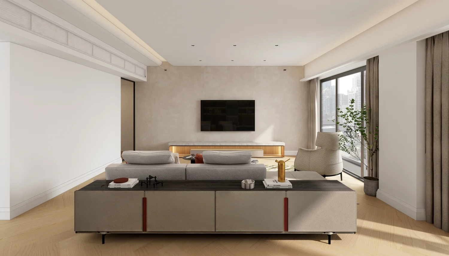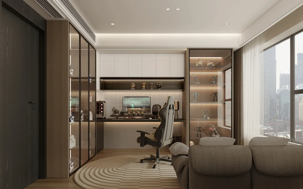 The male owner’s gaming room is decorated in calm dark gray and wood tones, with a display cabinet space of geometric lines. It can be converted into a study or a guest room,and the overall atmosphere is calm and restrained.