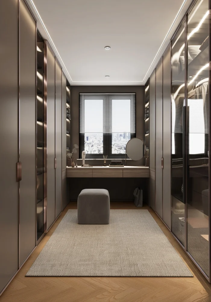 The walk-in closet, is made of natural wood intertwined with rose metal edges, which is exquisite and elegant.