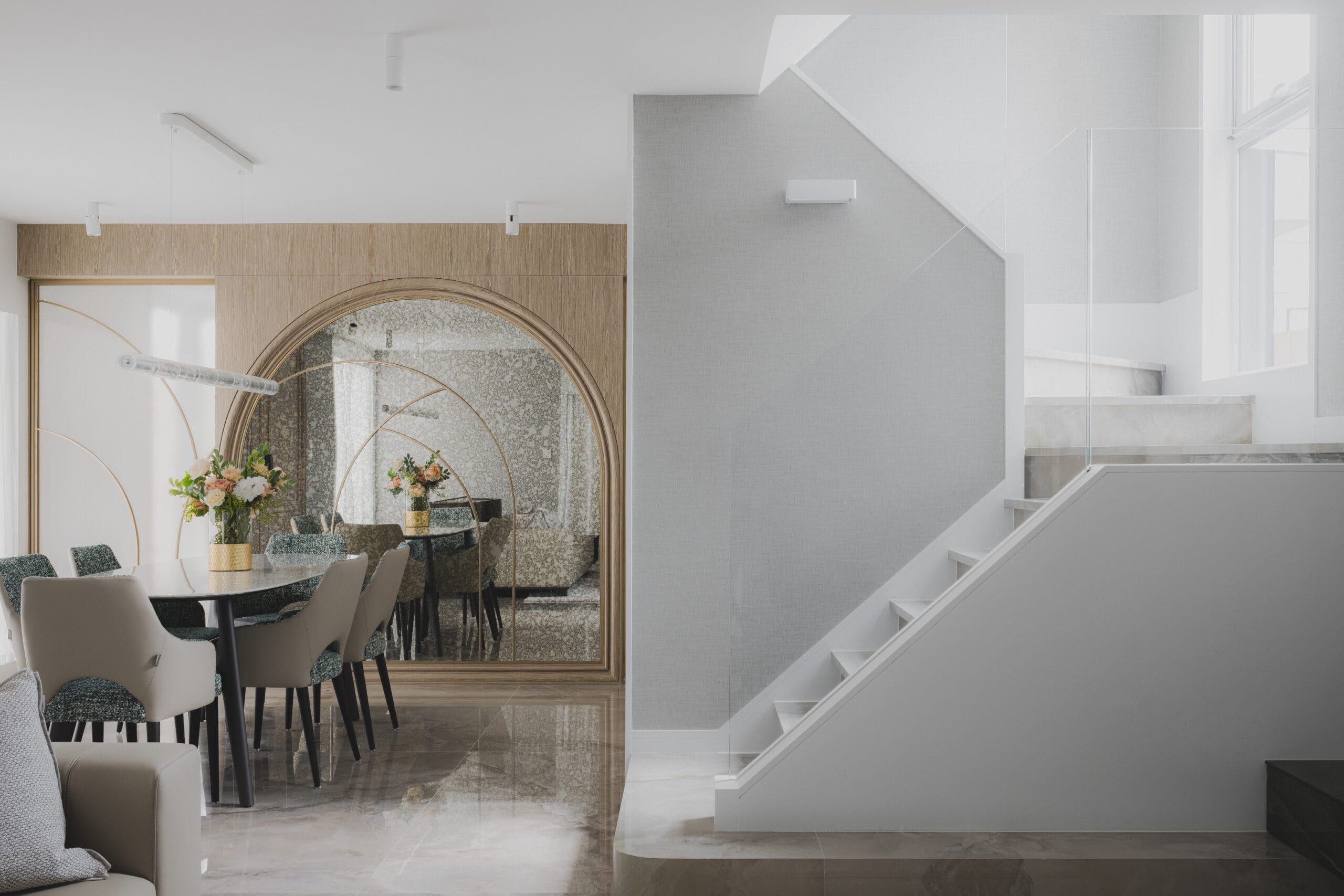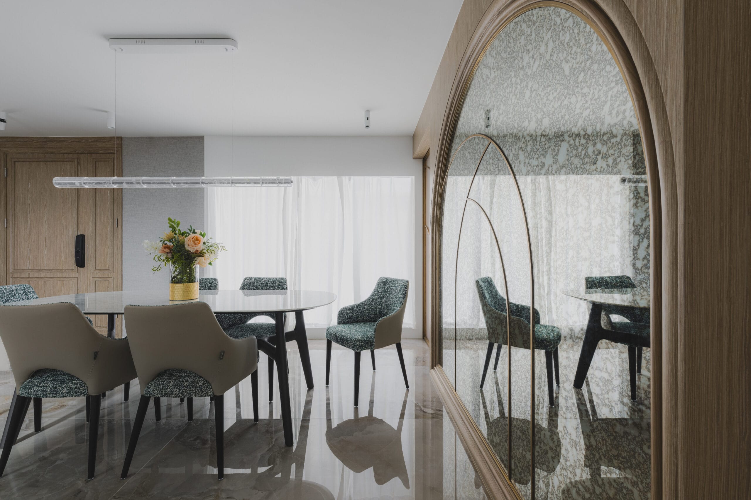 The dining room adopts a simple and classic design, with rose gold arch lines spliced with metal mirrors and wood veneer to decorate the kitchen door and the wall opposite. The transparent material reflects bright light spots, bringing a refined atmosphere to the entire dining room space.
