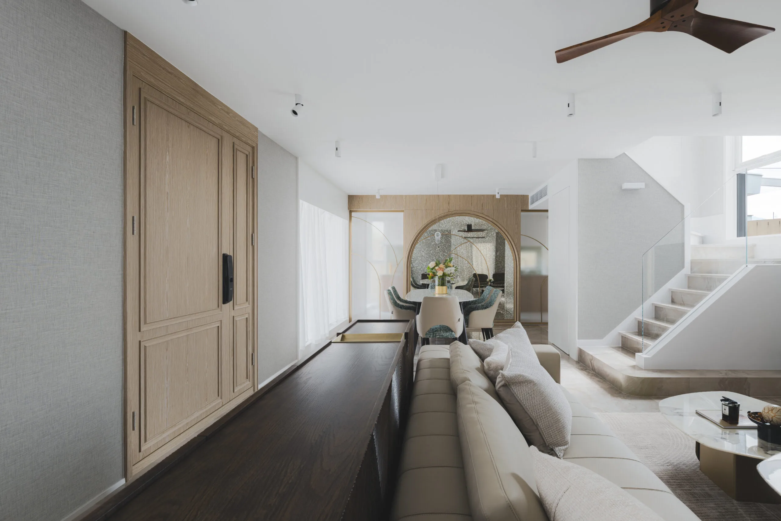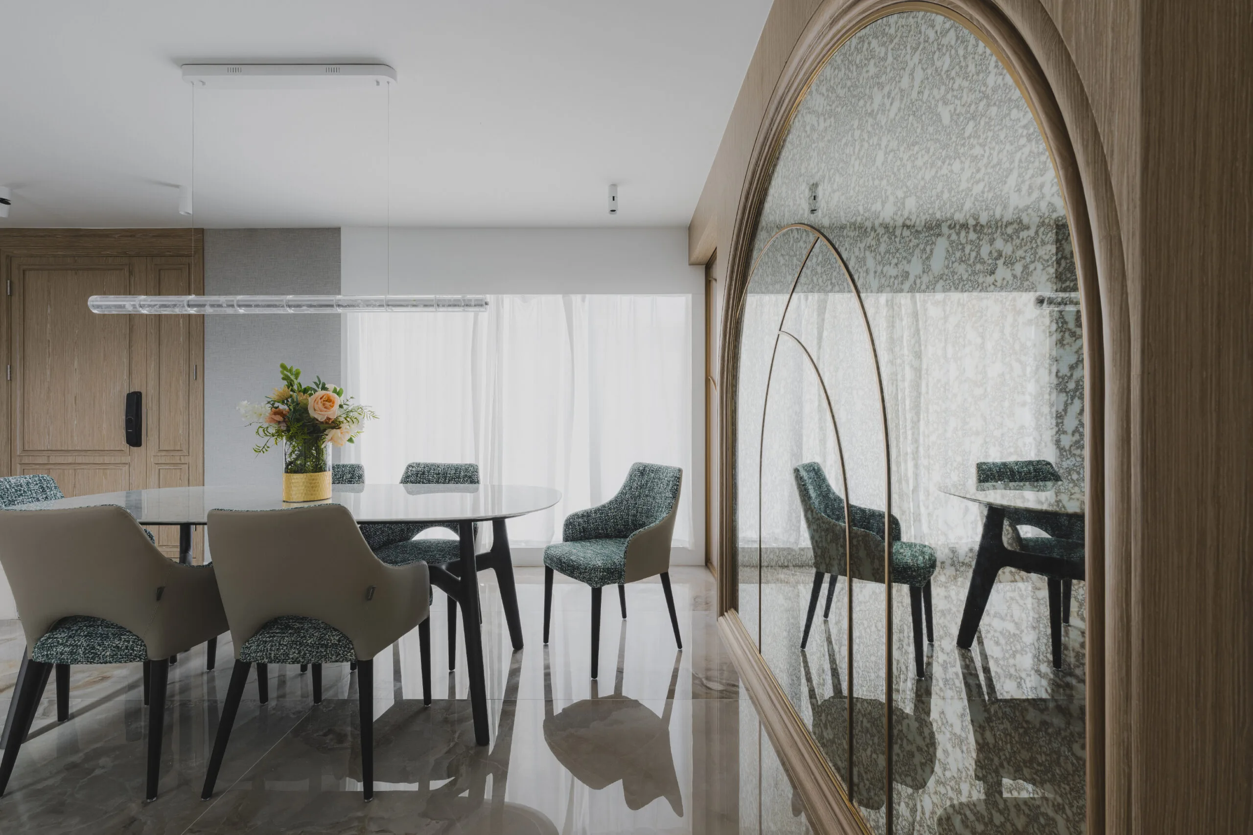 The dining room adopts a simple and classic design, with rose gold arch lines spliced ​​with metal mirrors and wood veneer to decorate the kitchen door and the wall opposite. The transparent material reflects bright light spots, bringing a refined atmosphere to the entire dining room space.