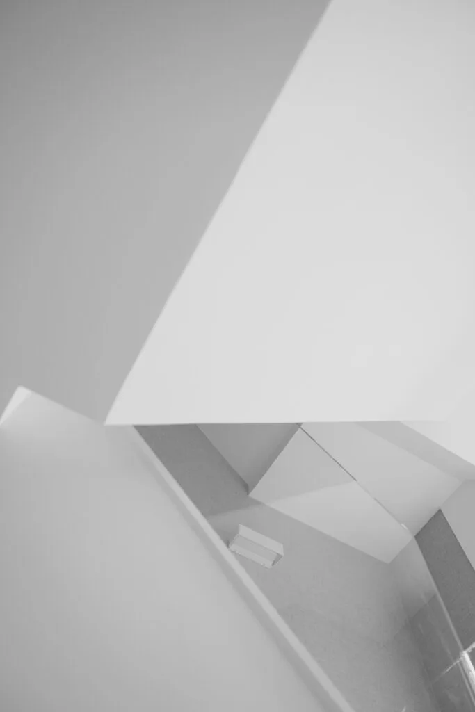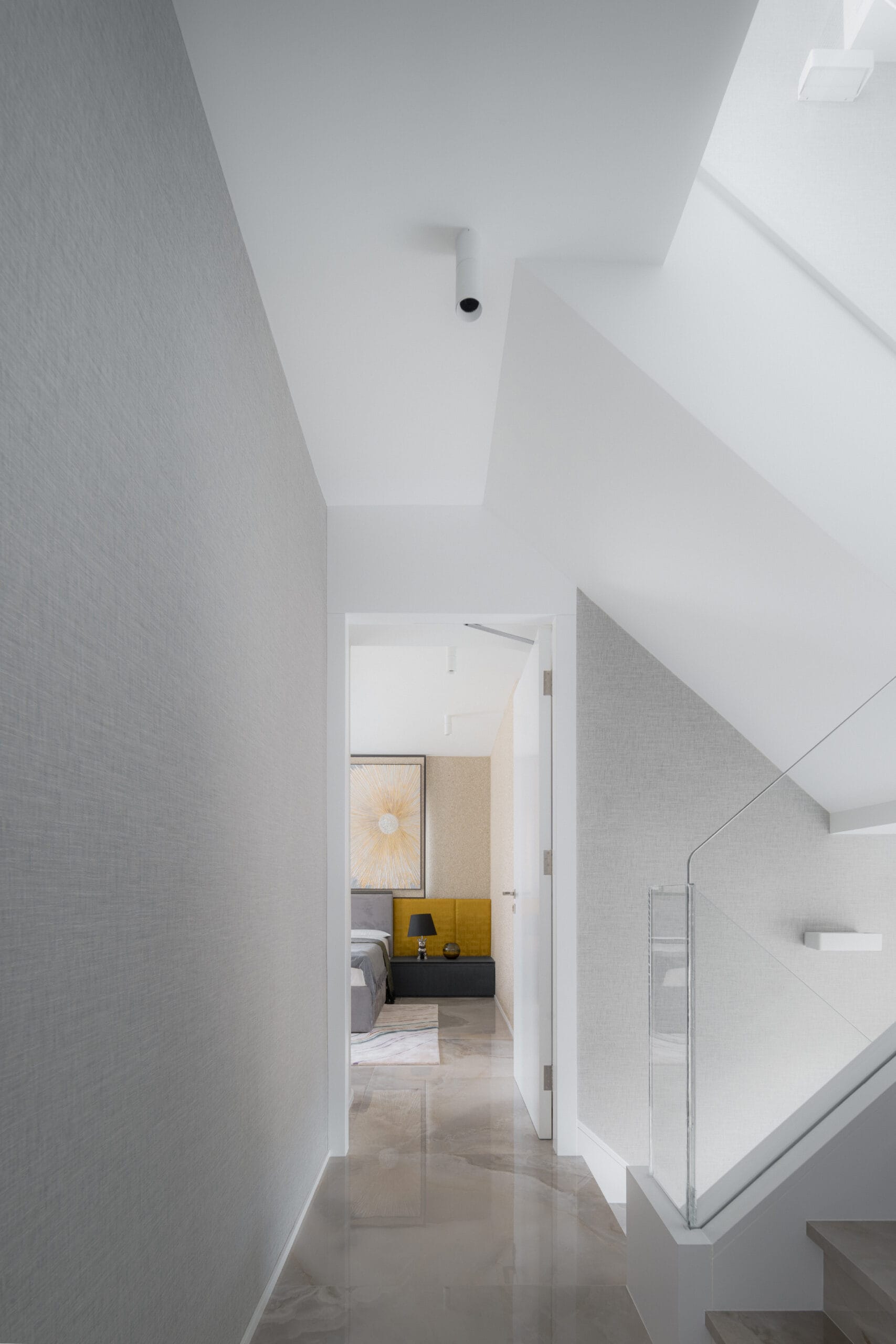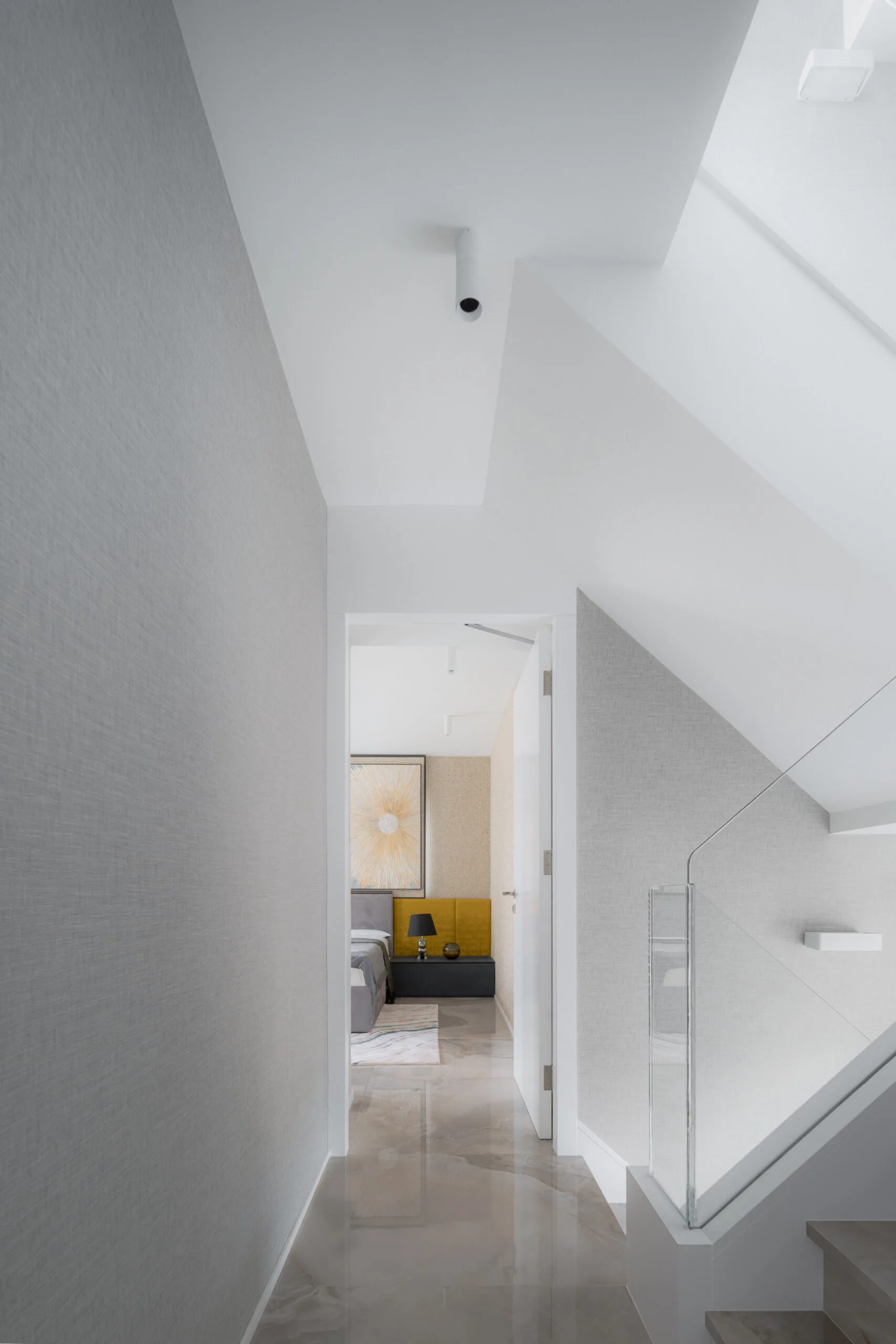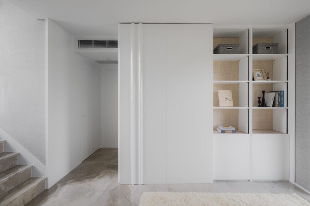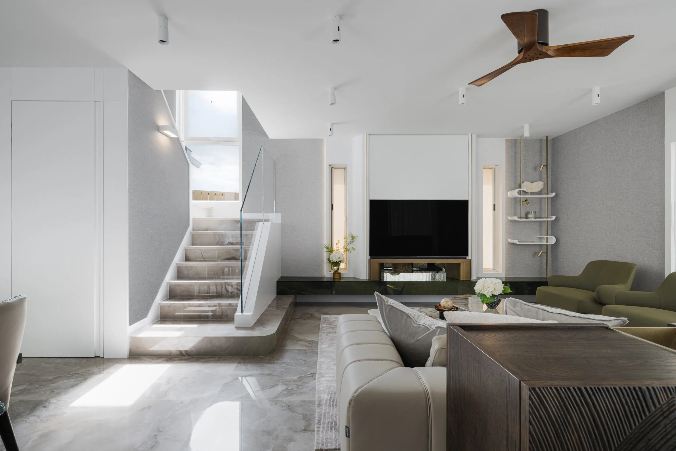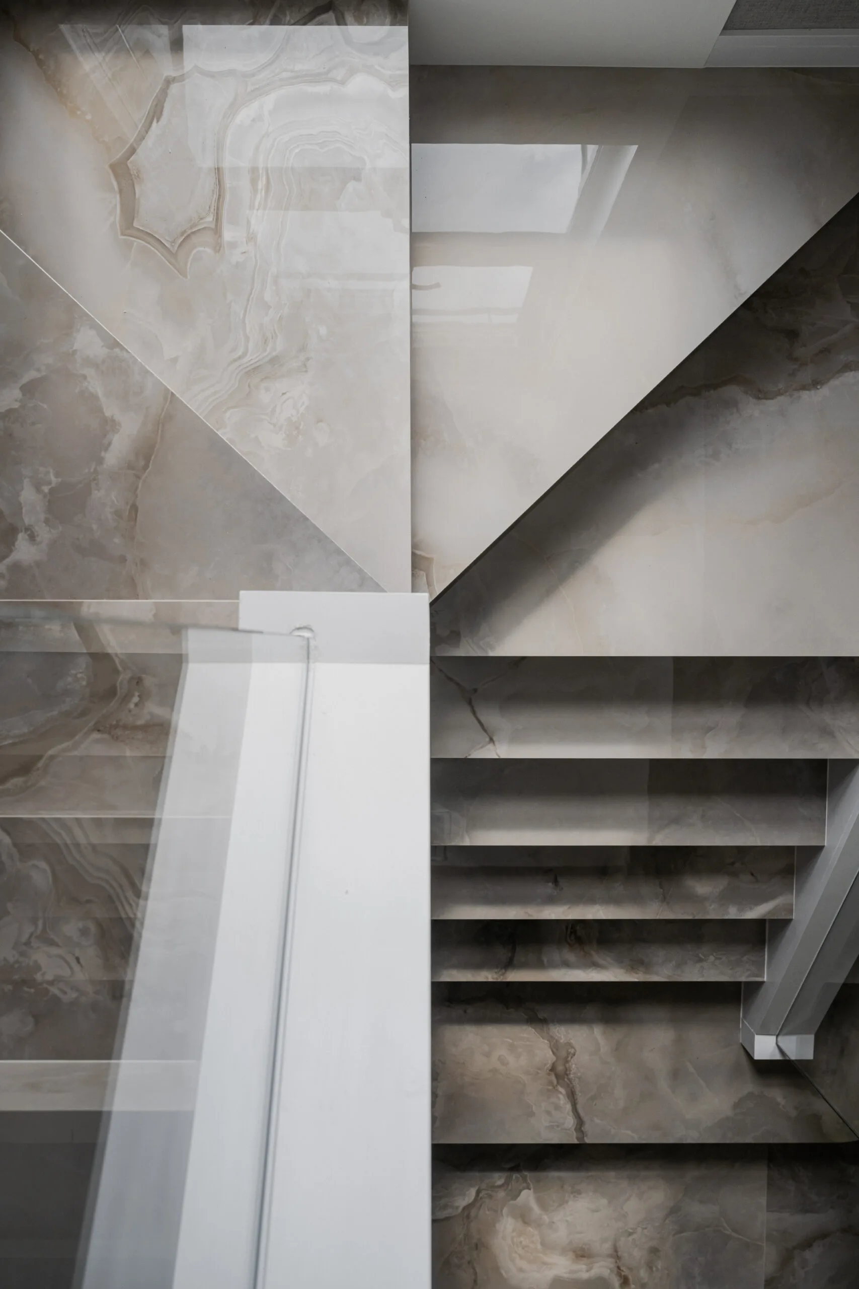 The stairs connecting each floor are made of white marble, and the handrails are made of glass, which enhances the brightness and beauty of the space.