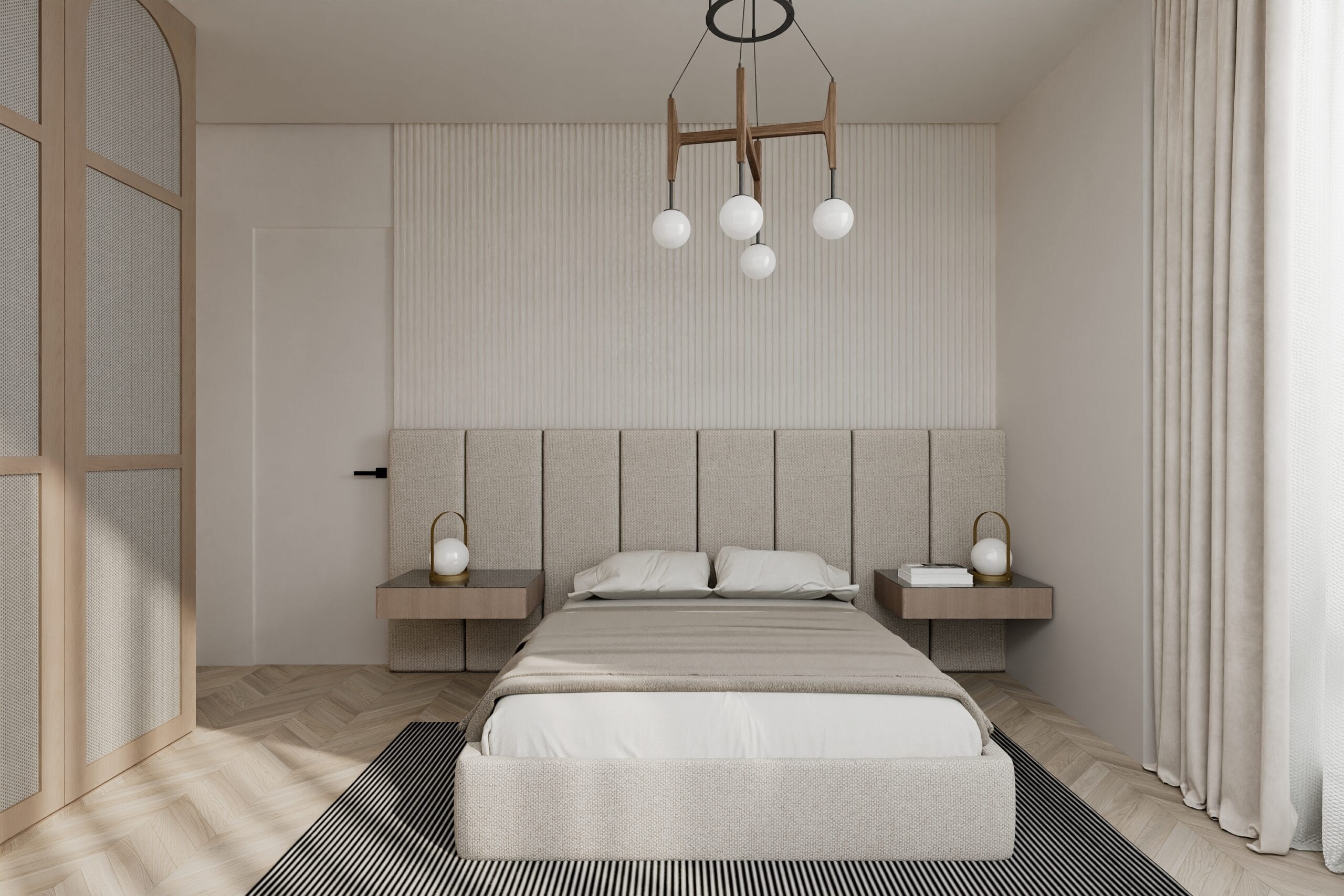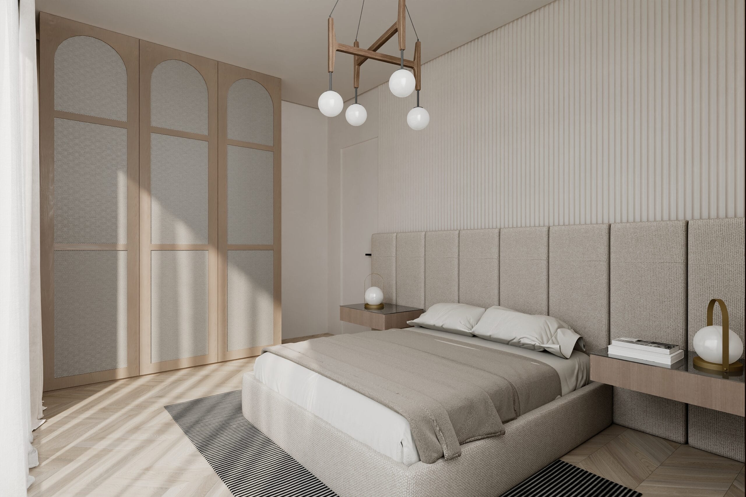 The master room is designed with simple and light French elements as the main design style. The artistic light apricot striped texture wallpaper is used above the bed, combined with earth-color fabric bedside cushions of similar colors, and an arch-shaped wardrobe made of rattan material, making the room There is a leisurely and romantic atmosphere.