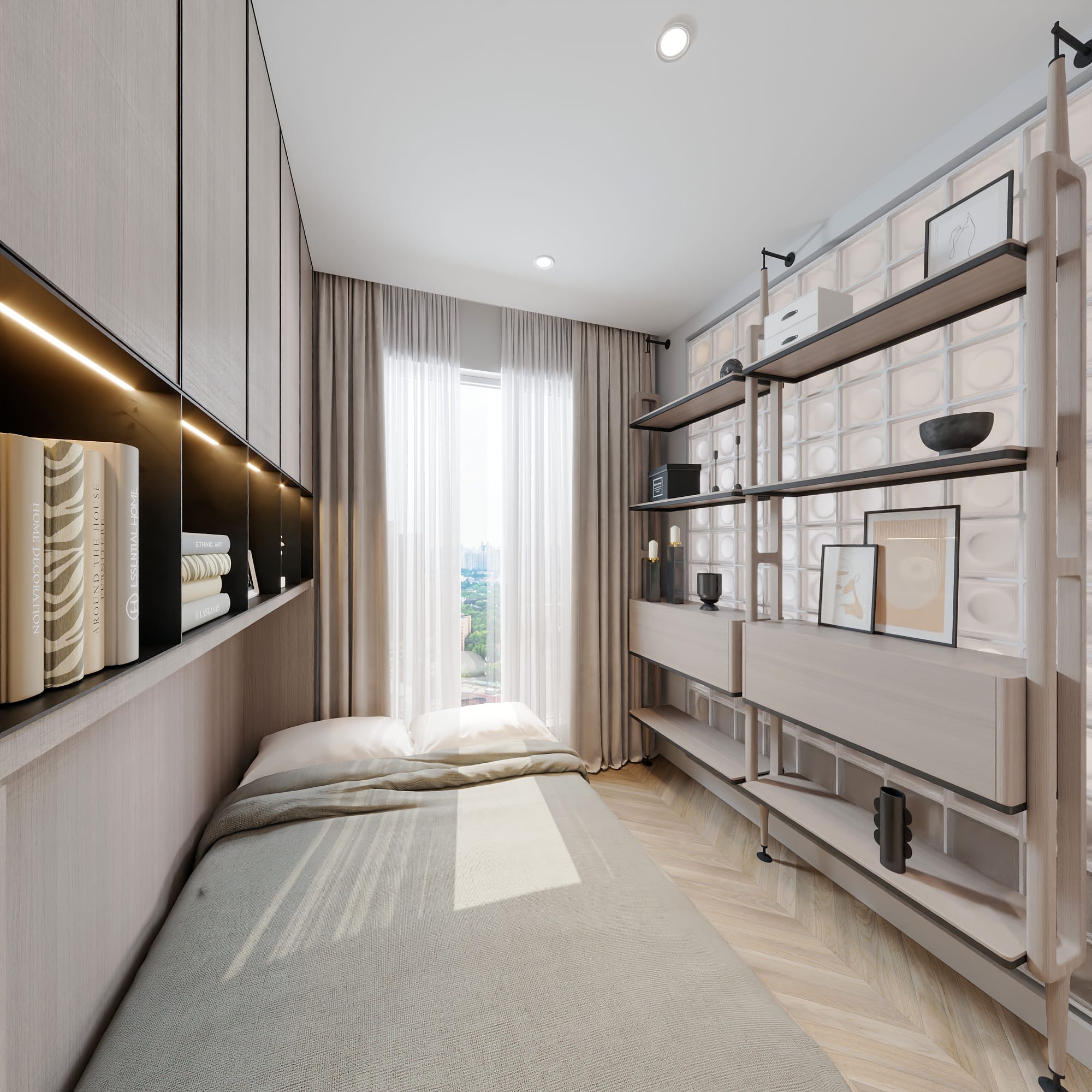 The owner hopes to make the guest room a multi-purpose space, so he added a set of hidden reverse beds, which does not take up space and improves the practicality of the space. He also designed an open shelf for the owner to place decorations .