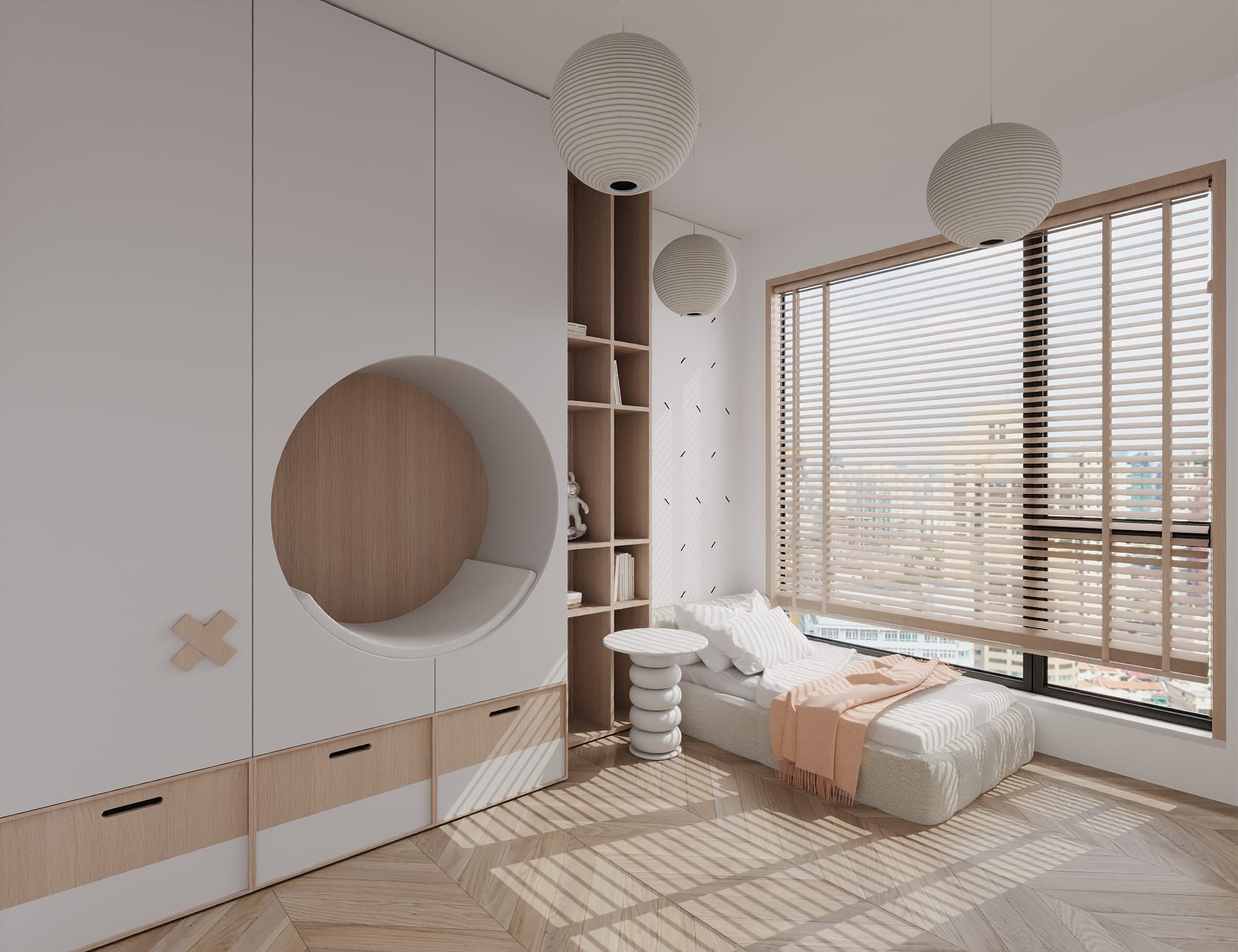 The daughter’s room is dominated by wood and warm white tones. There is a circular space in the large wardrobe with soft cushions. Here, you can talk to the children, tell stories, and enjoy the warm moments between mother and son. It also has a storage function.