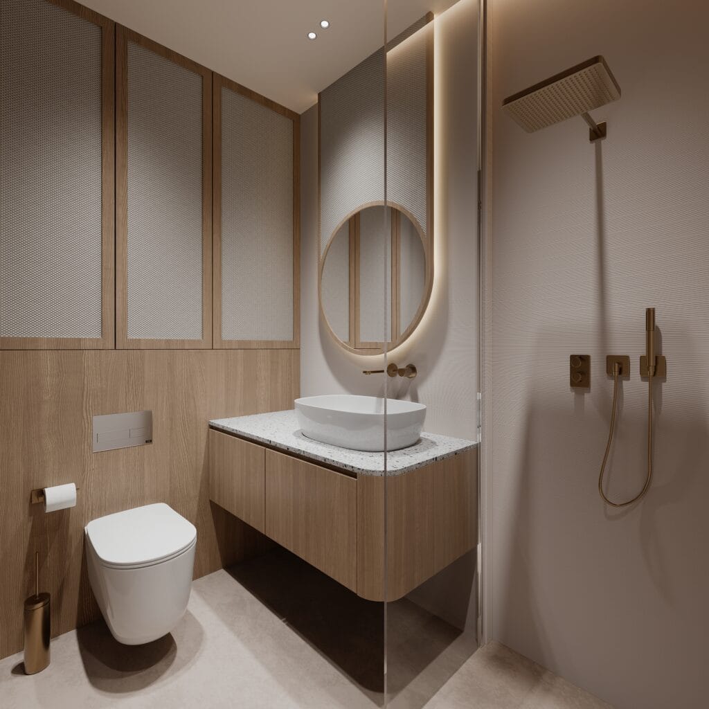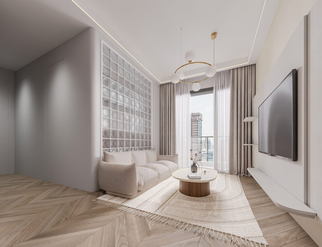 The design is based on the pursuit of the flow and penetration of light and shadow. The whole room is decorated in gentle off-white tones. Through the ingenious combination of glass bricks, rattan materials, natural stones and cream-colored fabrics, the space is It creates a comfortable and clear atmosphere.
