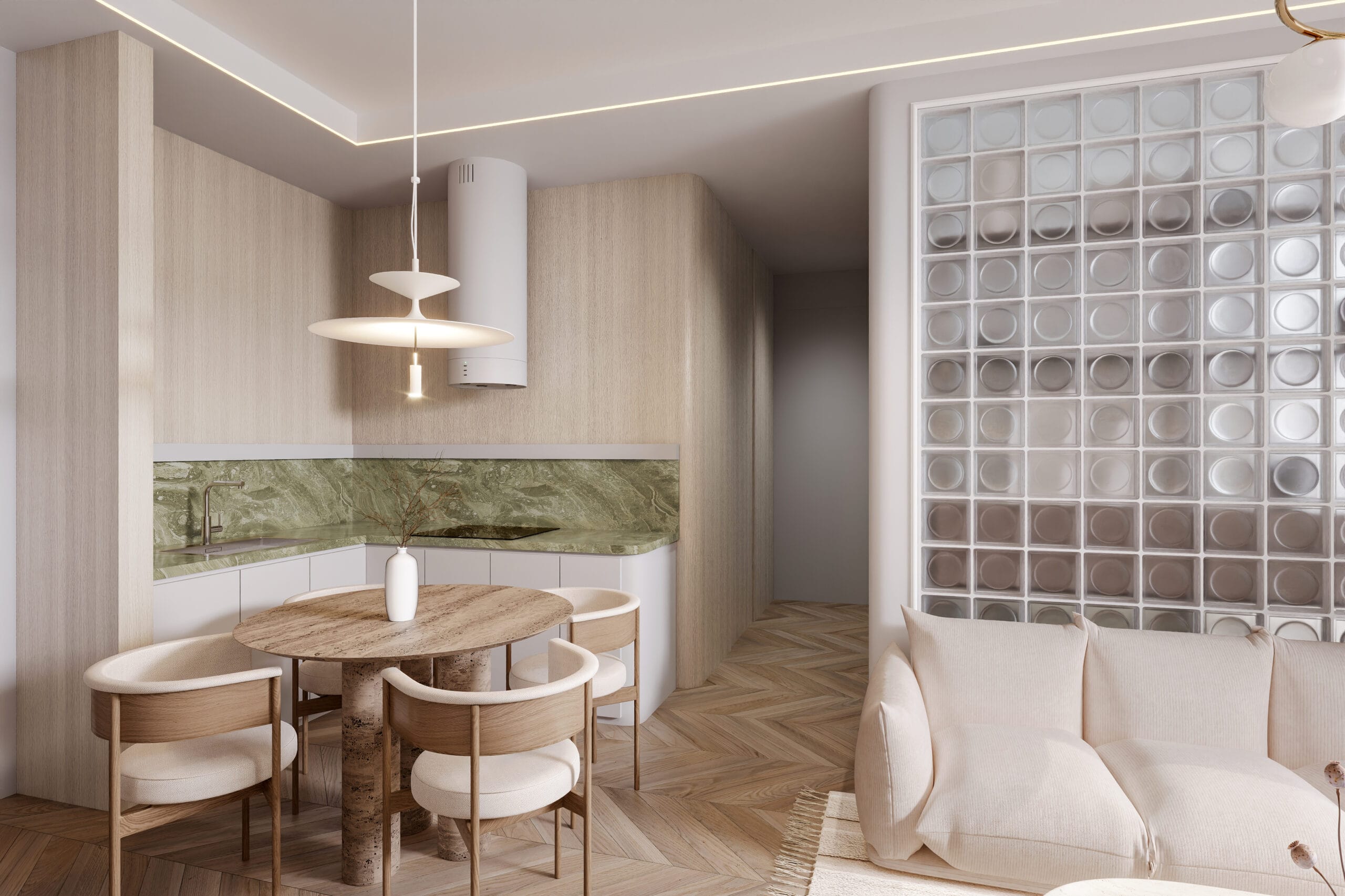 The open kitchen is one of the design highlights of the home. The walls are covered with green marble according to the preference of the female householder, showing her personal taste. It is matched with elegant light wood kitchen cabinets and is decorated with exquisite golden modern art chandeliers. Place a four-person light beige travertine dining table and fabric dining chairs to create an elegant, fresh and bright atmosphere.